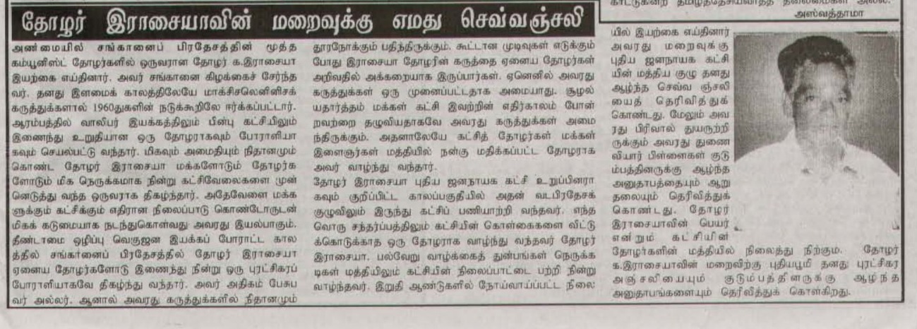 தோழர் இராசையாவின் மறைவுக்கு எமது செவ்வஞ்சலிஅண்மையில் சங்கானைப் பிரதேசத்தின் மூத்த கம்யூனிஸ்ட் தோழர்களில் ஒருவரான தோழர் க.இராசையா இயற்கை எய்தினார். அவர் சங்கானை கிழக்கைச் சேர்ந்தவர். தனது இளமைக் காலத்திலேயே மாக்சிச லெனினிசக் கருத்துக்களால் 1960துகளின் நடுக்கூறிலே ஈர்க்கப்பட்டார். ஆரம்பத்தில் வாலிபர் இயக்கத்திலும் பின்பு கட்சியிலும் இணைந்து உறுதியான ஒரு தோழராகவும் போராளியாகவும் செயல்பட்டு வந்தார். மிகவும் அமைதியும் நிதானமும் கொண்ட தோழர் இராசையா மக்களோடும் தோழர்களோடும் மிக நெருக்கமாக நின்று கட்சிவேலைகளை முன்னெடுத்து வந்த ஒருவராக திகழ்ந்தார். அதேவேளை மக்கஞக்கும் கட்சிக்கும் எதிரான நிலைப்பாடு கொண்டோருடன் மிகக் கடுமையாக நடந்துகொள்வது அவரது இயல்பாகும்.